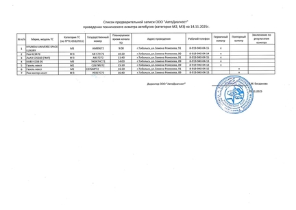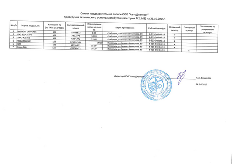 Обращаем Ваше внимание, что технический осмотр автобусов производится совместно с сотрудниками ГИБДД. Запись автобусов производится не менее чем за 5 рабочих дней, в соответствии законодательством о ТО.